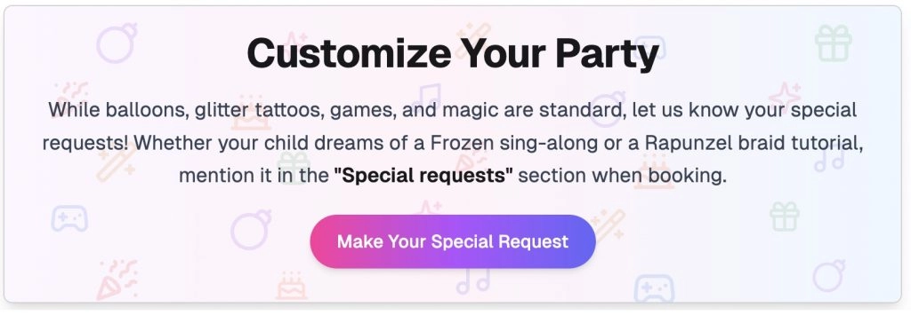 Our talented entertainers bring unforgettable celebrations to children all across London. Whether you’re planning a party in Kensington, Croydon, Richmond, Romford, or anywhere within the M25, our team is ready to make your event truly special.